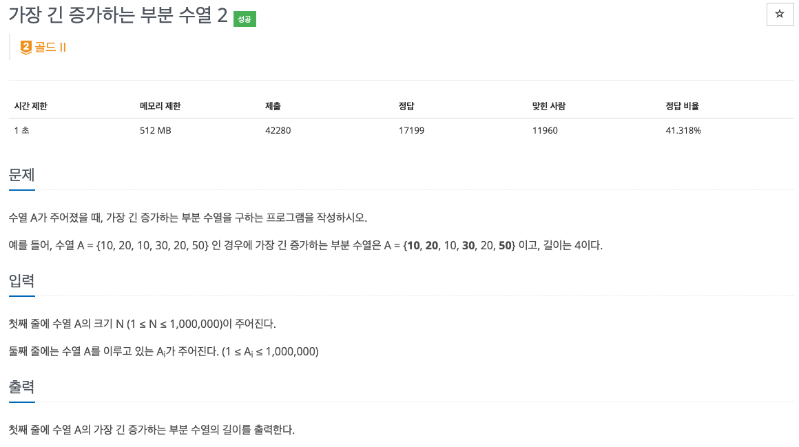 https://www.acmicpc.net/problem/12015 12015번: 가장 긴 증가하는 부분 수열 2 첫째 줄에 수열 A의 크기 N (1 ≤ N ≤ 1,000,000)이 주어진다. 둘째 줄에는 수열 A를 이루고 있는 Ai가 주어진다. (1 ≤ Ai ≤ 1,000,000) w