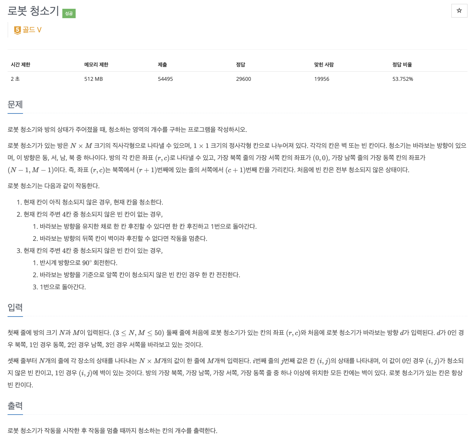 쉬운 구현 문제이다. 동서남북~ 에서 BFS를 사용하라는 것을 대놓고 보여준다. 문제에서 주는 작동 방식을 정말 그.대.로 구현하면 된다. 주의할 점은 방향을 다루는 것인데 문제에서 제시한 방향은 0북 1동 2남 3서 이지만 반시계 방향으로 회전하는 것은 북->서->남->동 이기 때문에 잘 처리해주어야 한다. 나 같은 경우 dir 배열을 0북 1동 2남 3서 그대로 만들고, 인덱스를 거꾸로 가도록 구현하였다. 후진은 어떻게 처리할지 고민해보면 좋을 것 같다. (if문을 덕지덕지 만들어 구현할 순 있지만 조금 더 간단한 방법은 없을지~?)