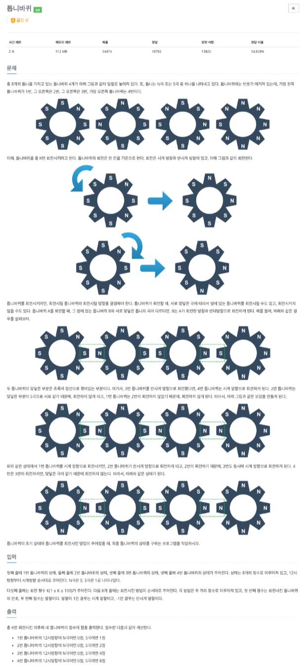 문제 그대로 구현하면 되는 쉬운 문제이다. 톱니바퀴를 나타내는 클래스를 하나 만들고, 시계 또는 반시계 방향으로 움직이는 메서드를 만들었다.