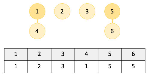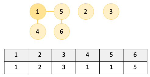 여기서 union(4, 6)을 수행했을 때, 위에서 설명한 것과 같이 생각해보면 각 집합의 대표 노드는 최솟값을 가지는 노드이고 {1, 4}와 {5, 6}을 합쳤을 때 최솟값을 가지는 노드는 1이기 때문에 해당 배열의 값을 전부 1로 변경해야 된다. 하지만 만약 각 집합의 개수가 10억개라면 10억개의 배열을 모두 업데이트 해줘야하기 때문에 비효율적인 방법이다. 따라서, union 연산을 수행할 때 해당 집합의 모든 원소의 배열 값을 업데이트 하는 것이 아니라 대표 노드의 배열 값만 업데이트 해준다. 각 집합의 대표 노드를 찾기 위해서는 find 연산을 수행하면 된다.