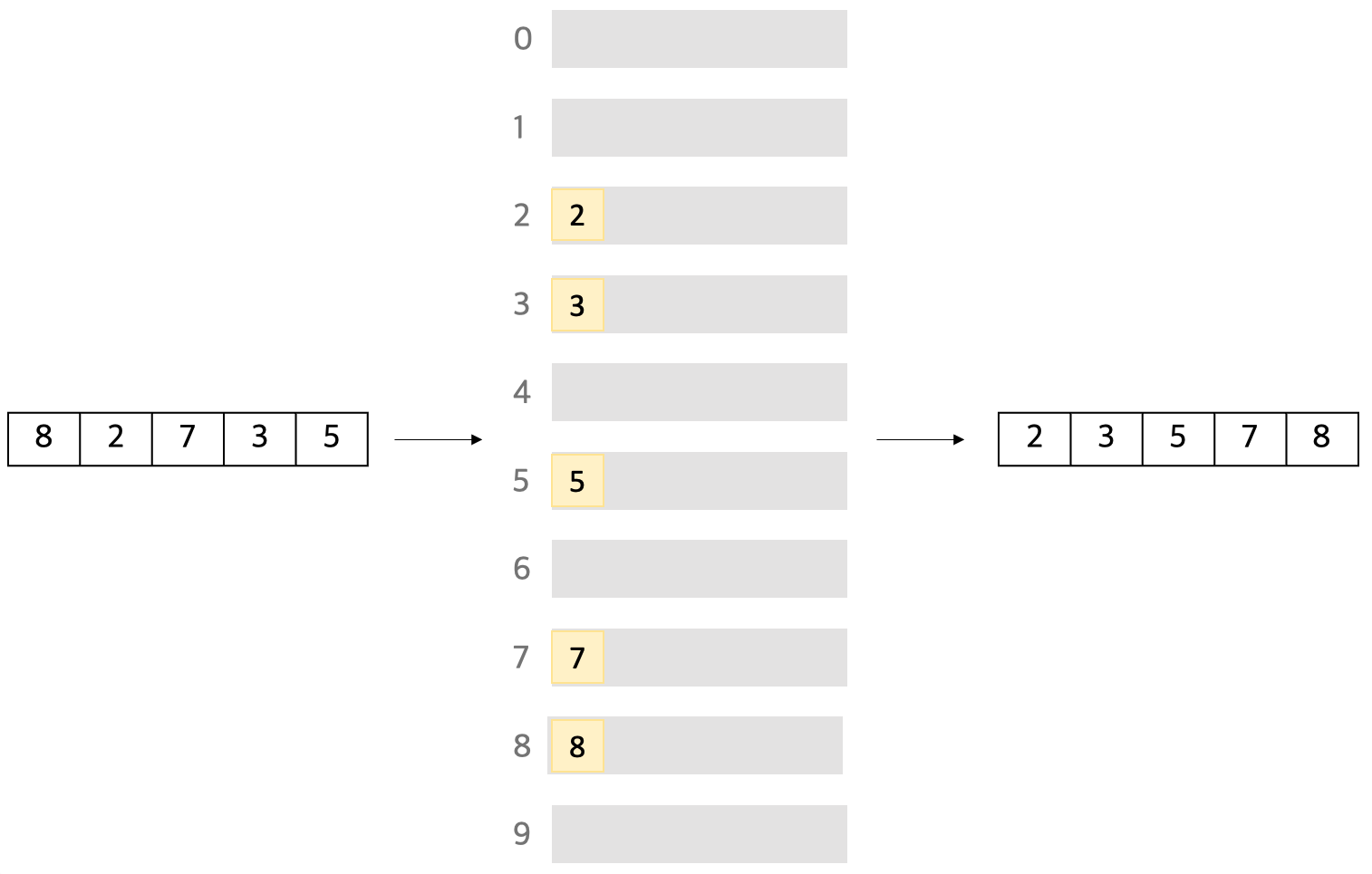 - d개의 자리수를 가지는 n개의 수가 존재한다면 $O(d * n)$ 의 시간 복잡도를 가진다. 즉, d에 비례하기 때문에 정수의 크기와 관련이 있다. 하지만 일반적으로 10개 정도의 자리수를 가지므로 시간 복잡도는 $(O(n)$ 이라고 해도 무방하다.