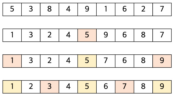 퀵 정렬의 전체 과정은 아래와 같다. 빨간색이 이번 턴에 정해진 pivot이다. 여기서 한 가지 알 수 있는데, 리스트에서 pivot을 선정할 때 리스트의 가장 작거나 큰 값이 pivot이 되는 경우 비효율적이라는 것을 알 수 있다. 여기서는 1과 9가 pivot이 된 경우를 생각하면 된다.