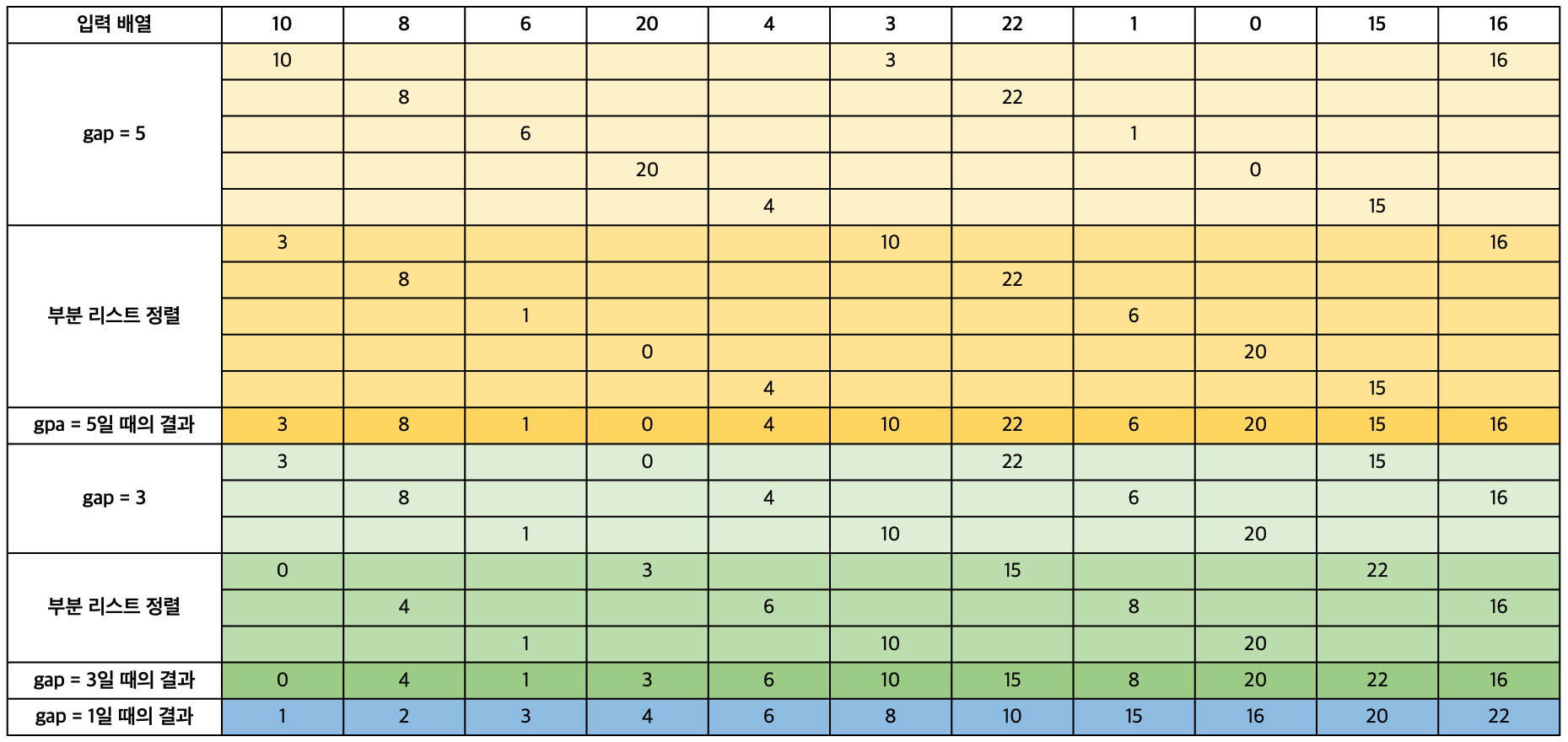부분 리스트를 만들 때에는 간격을 특정한 수로 정해서 만든다. 이때의 간격을 gap이라고 한다. 각 step 마다 gap을 줄여가며 진행한다. (보통 간격은 1/2 줄인다. 간격이 짝수인 경우 1을 더하는 것이 좋다고 한다.) 즉, 진행될수록 부분 리스트의 개수는 증가한다. 마지막 step에서는 gap이 1이다. 그림을 보면 한 번에 이해할 수 있다!