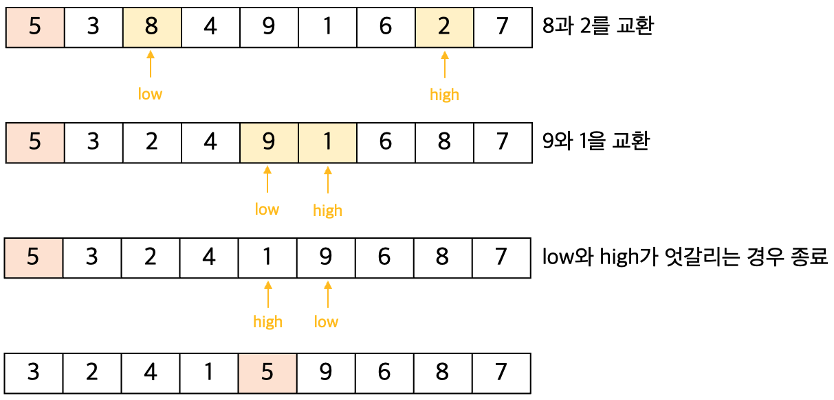 쉽게 생각하면, low는 왼쪽 부분 리스트를 만들어야 하는데 pivot과 큰 값이 있어서 멈췄고 high도 마찬가지로 pivot보다 작은 값이 있어서 멈췄다. 서로 있으면 안되는 데이터이기 때문에 교환해주면 된다.