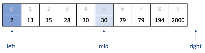 3. 여기서 주의할 점은 mid가 가리키는 값이 target이 되었다고해서 반복문을 빠져나오면 안된다는 것이다. 그림에서도 알 수 있듯이 우리는 target보다 크거나 같은 값을 찾는 것이므로 과정을 한 번 더 진행해준다.