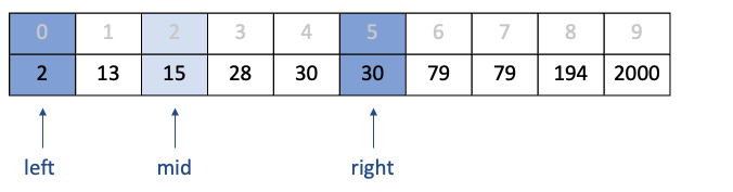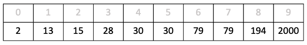 위와 같은 데이터 셋이 있을 때 30의 Lower bound는 arr[4] = 30이고 Upper bound는 arr[6]이 = 79다. 만약 30 이상의 값이 나타나는 첫번째 인덱스가 아닌 마지막 인덱스를 찾고 싶으면 Upper bound - 1을 해주면 된다.