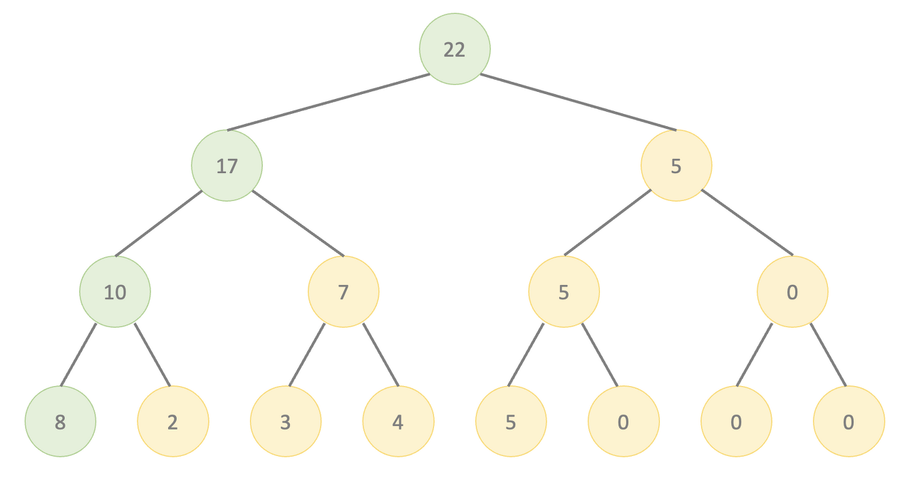 부모 노드는 자식 노드의 합이라는 것을 볼 수 있다. 여기서 주의해야 하는 점은 이진 트리의 각 계층은 2의 제곱수만큼 노드를 가져야 하는데, 우리 예시는 노드가 5개 뿐이다. 즉, 5보다 큰 2의 제곱수인 8보다 3개 모자르다. 따라서 현재 우리는 구간의 합을 구하는 문제이기 때문에 합에 영향을 끼치지 않는 0으로 채워준다.